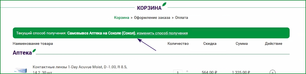 1. В корзине заказа в верхней части отображается текущий способ получения