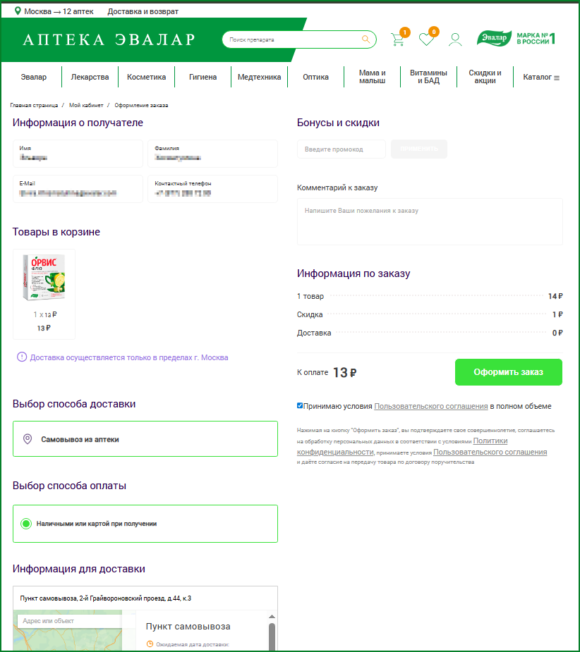 2. Если вы выбрали самовывоз из аптеки, то вам доступна оплата наличными или картой по получению товара в аптеке.