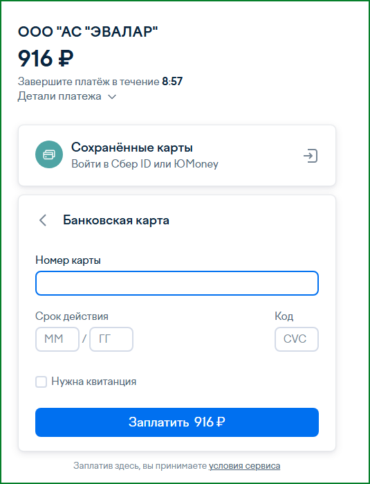 Для оплаты будете перенаправлены на страницу сервиса безопасного приема платежей.