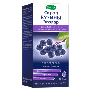 «Сироп бузины Эвалар» изготавливается из плодов черной бузины, уровень антиоксидантной активности которой в два раза выше, чем у черники и клюквы. Состав комплекса усилен витаминами С, D, В6, фолиевой кислотой и цинком.