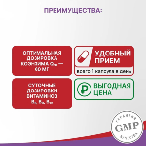 - Максимальные дозировки компонентов: на 100% закрывает суточную потребность в витаминах В6, В9 и В12, на 200% – коэнзима Q10.