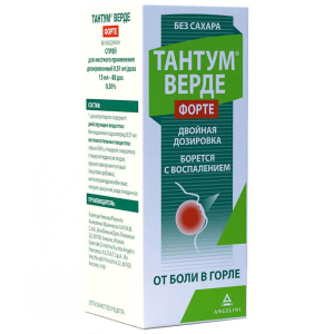 Спрей Тантум верде форте предназначен для лечения заболеваний полости рта и горла, таких как фарингит, тонзиллит, стоматит, гингивит и др. Композиция препарата содержит активное вещество - бензидамин гидрохлорид, который обладает антисептическим, противовоспалительным и обезболивающим эффектом. Спрей легко наносится на слизистую оболочку горла и рта благодаря удобному дозатору и имеет приятный мятный вкус. Рекомендуется применять спрей Тантум верде форте для снятия болевых симптомов и уменьшения воспаления, облегчения глотания и общего состояния.