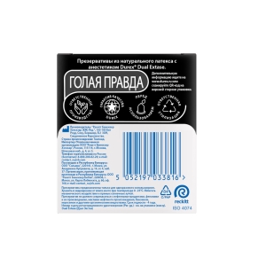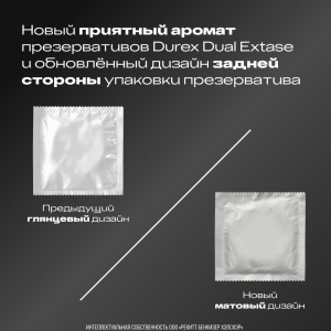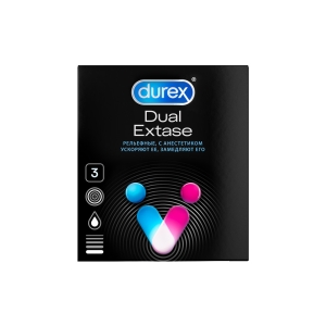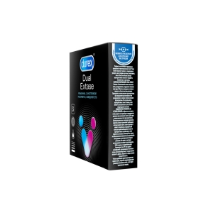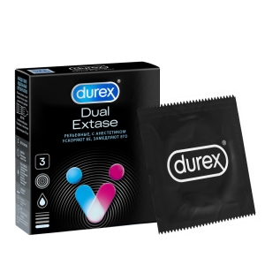 Анестетик (бензокаин - 0,14 г.) внутри презервативов Durex® Dual Extase может помочь продлить половой акт у мужчины, а ребра и пупырышки на поверхности презерватива могут помочь усилить стимуляцию и ускорить наступление оргазма у женщины. Обоюдное удовольствие – один из приоритетов сексуальных отношений!