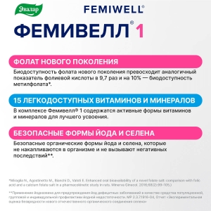 Комплекс Фемивелл®1 состоит из 15 витаминов и минералов в легкодоступной форме, в т.ч. активной формы ФОЛАТА НОВОГО ПОКОЛЕНИЯ, который необходим для зачатия и развития малыша.